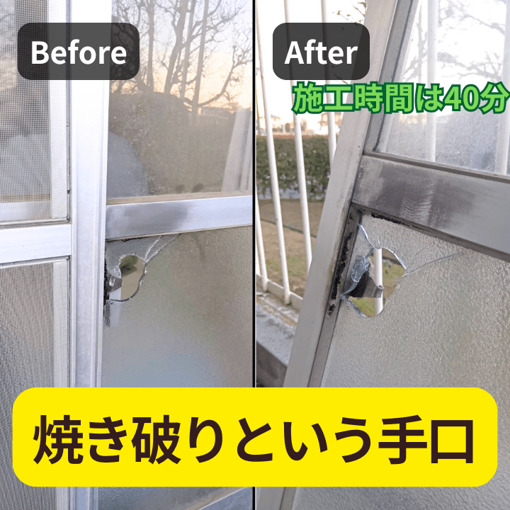焼き破りとは、ライターやバーナーなどでガラスの一部を熱し、急激に冷やして割る昔ながらの侵入方法です。
