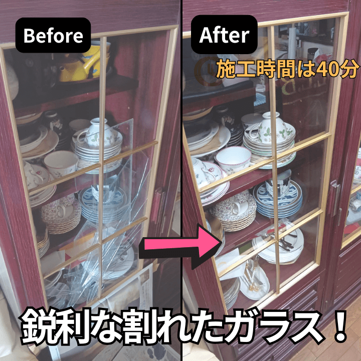 伊奈町|食器棚のガラス交換|鋭利に割れたガラスも40分で安全復旧