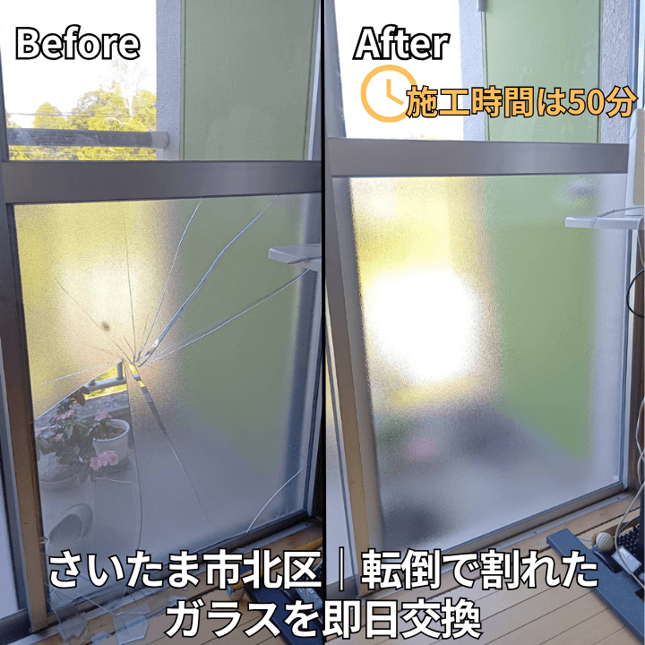 🪟さいたま市北区|転倒で割れたガラスを即日交換|安心のガラス修理